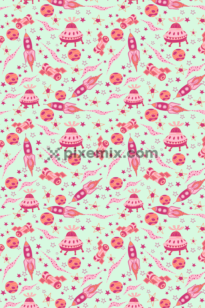 Space inspried UFO and space ship product graphic with seamless repeat pattern