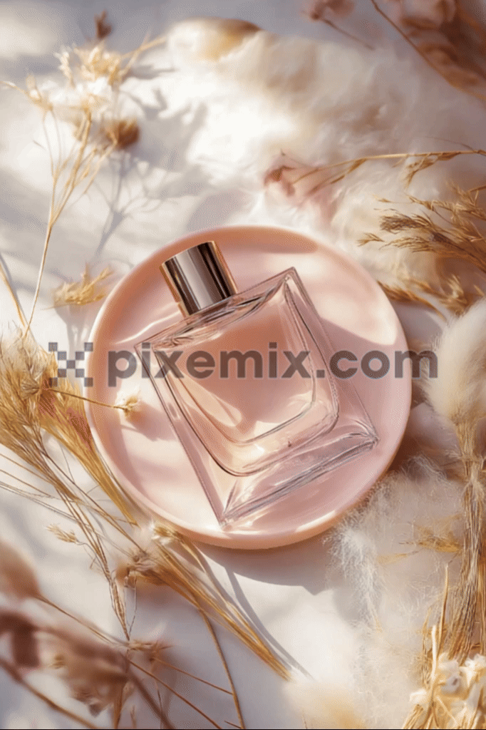 A delicate glass perfume bottle with a soft pink hue, elegantly placed on a matching pastel plate, surrounded by dried flowers and fluffy textures Stock Video.