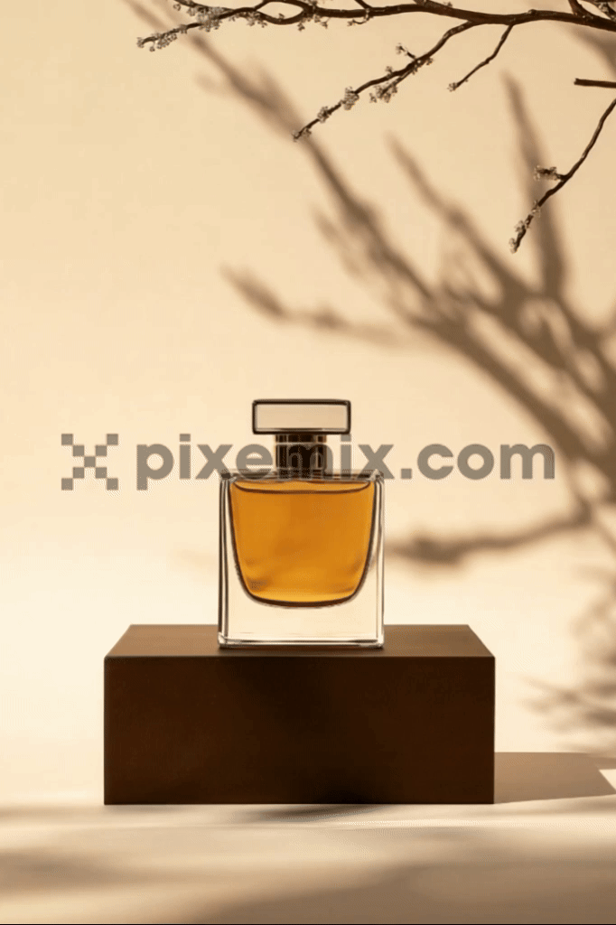 The sleek glass container filled with golden liquid rests atop a dark pedestal, with soft shadows of tree branches elegantly framing the composition Stock Video.