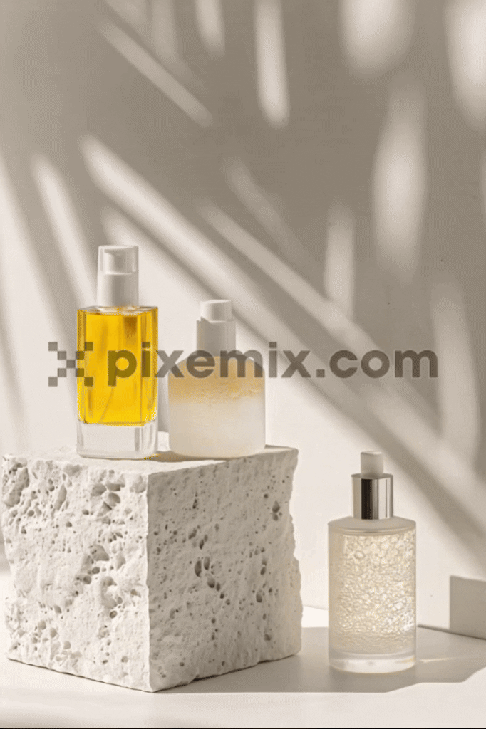 The bottles are placed on a textured stone block, emphasizing an organic and earthy vibe Stock Video.