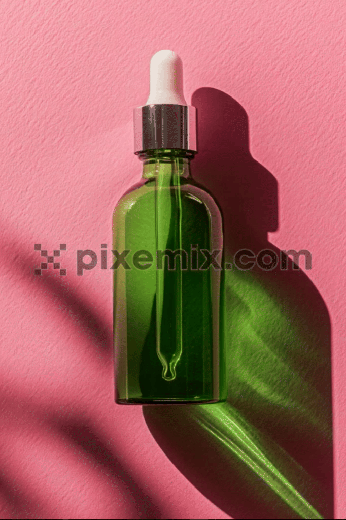 A vibrant and modern aesthetic with a green glass dropper bottle placed against a textured pink background Stock Video.