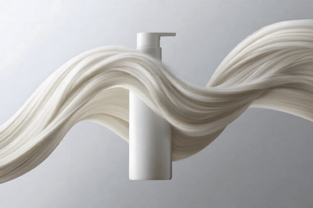 A minimalist white pump bottle surrounded by a flowing, creamy, ribbon-like texture, likely representing a product.