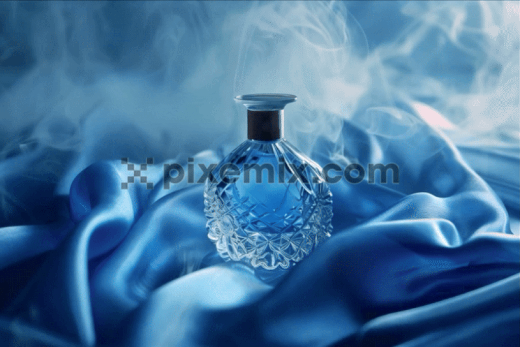 An intricately designed crystal perfume bottle containing a vivid blue liquid, placed on a luxurious satin fabric backdrop in matching blue tones.