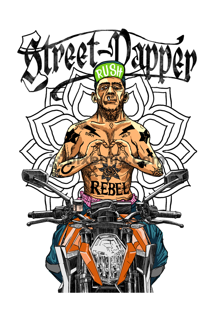 Street inspired tattoed man sitting on motor bike product graphic art with typography
