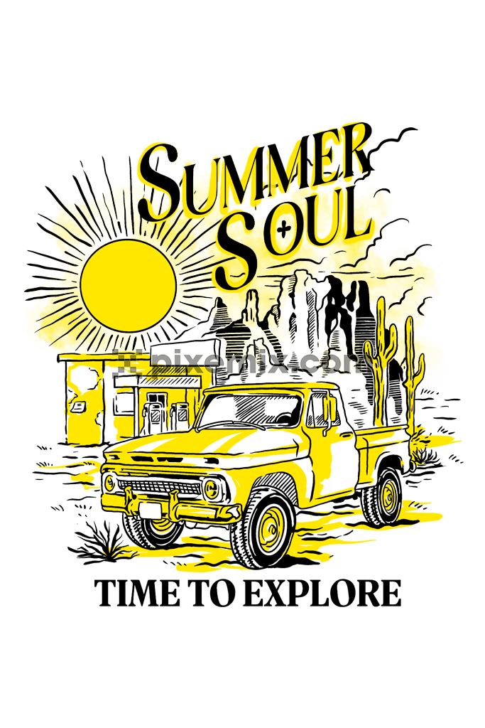 Adventure inspired hand-drawn jeep in countryside petrol station product graphic.