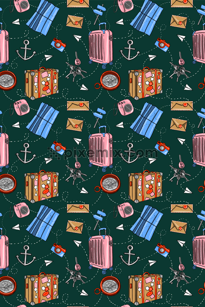 adventure inspired travel bag and key product graphic with seamless repeat pattern