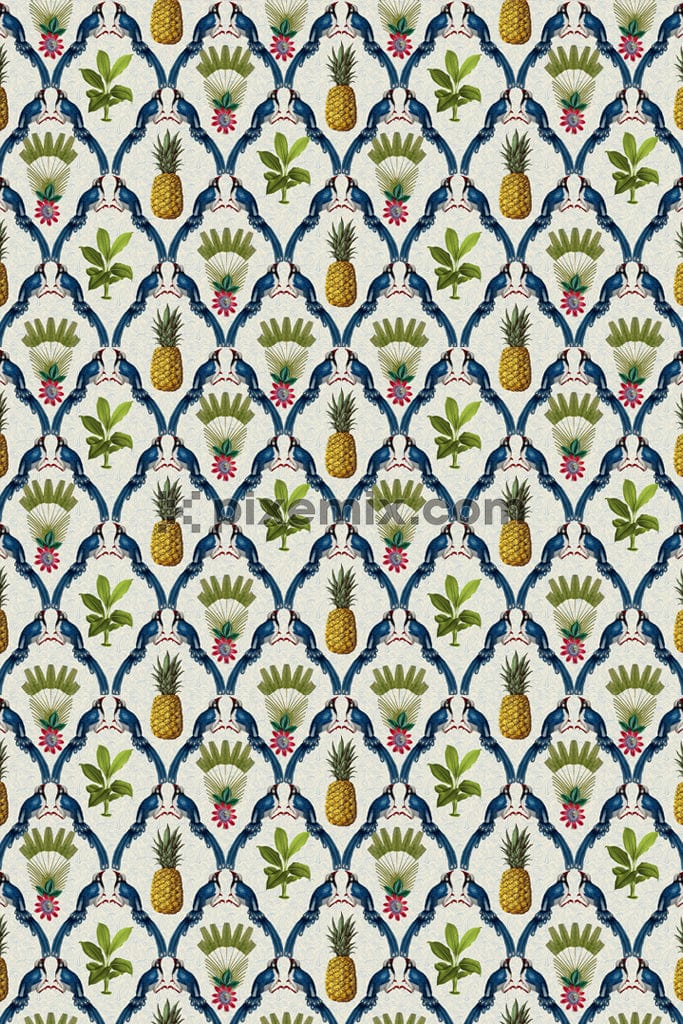 Tropical birds and pineapple product graphic with seamless repeat pattern