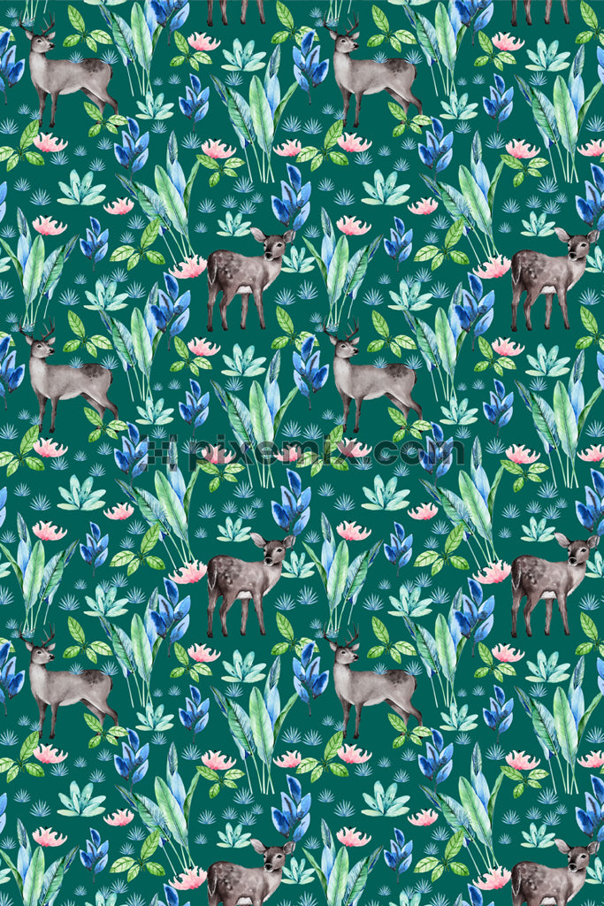 Deer in tropical jungle product graphic with seamless repeat pattern