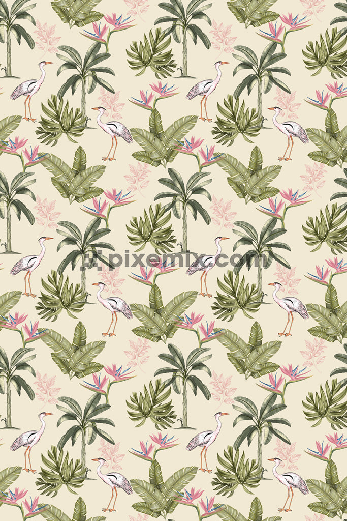This tropical-themed pattern features elegant herons, lush banana leaves, palm trees, and exotic bird of paradise flowers on a soft beige background.