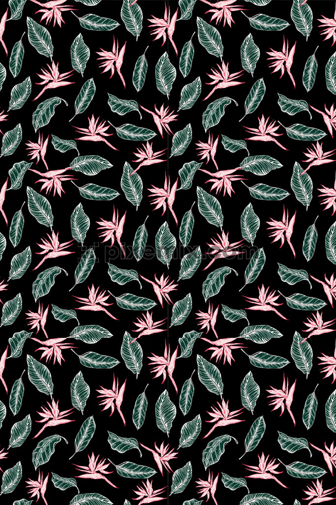Abstract tropical leaves and bird of paradise product graphic with seamless repeat pattern