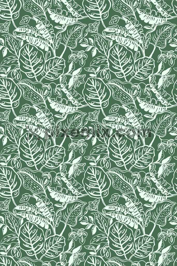 Tropical jungle leaf pattern in hand-drawn white lines over deep green background, seamless botanical design.