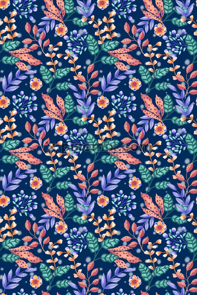 A vibrant floral pattern featuring various leaves and flowers in shades of orange, purple, and green graphic.