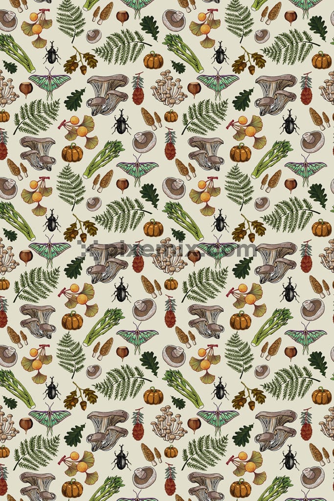 Hand-drawn vegetable garden and insects product graphic with seamless repeat pattern.
