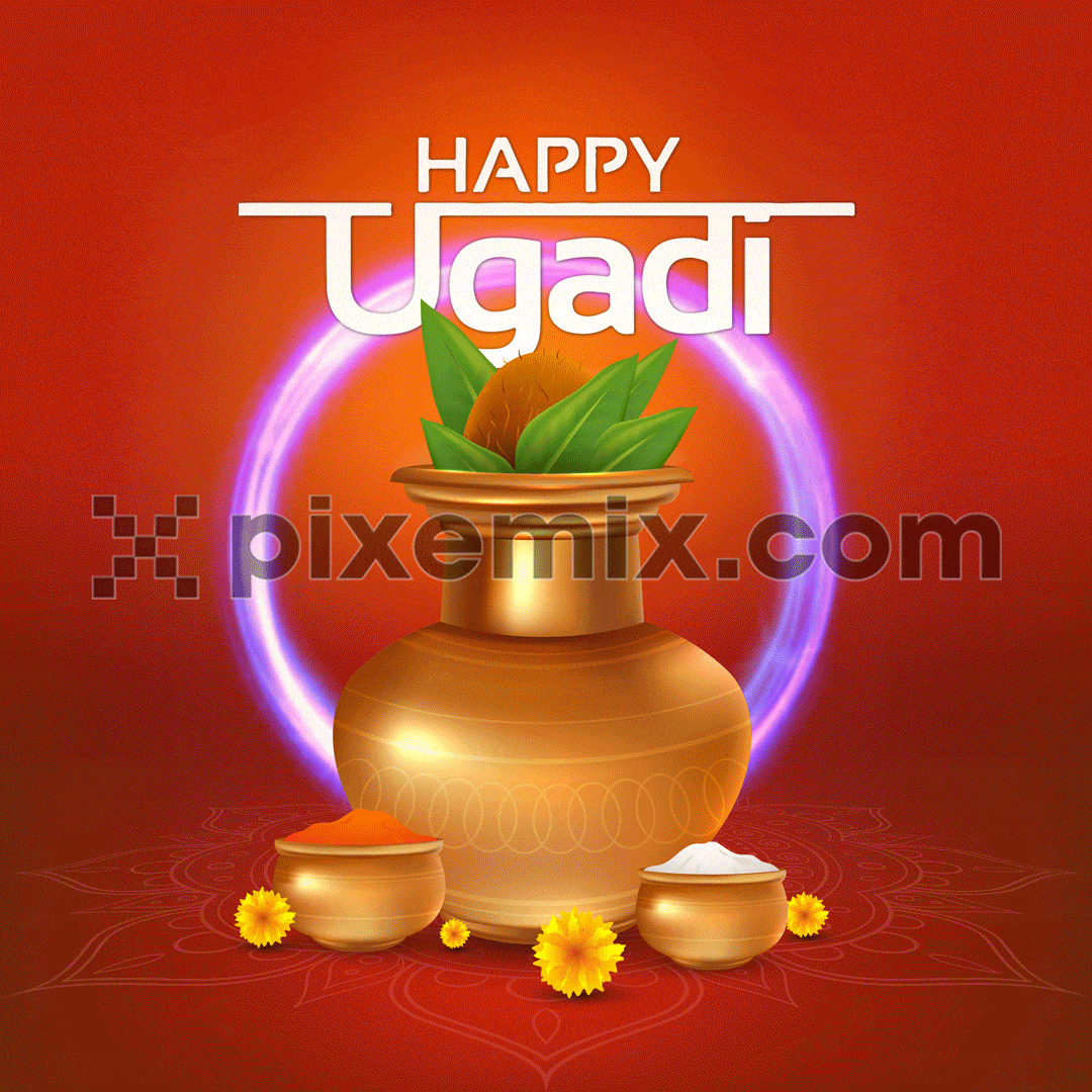 Realistic golden kalash with typography and ugadi festive essentials social media GIF post