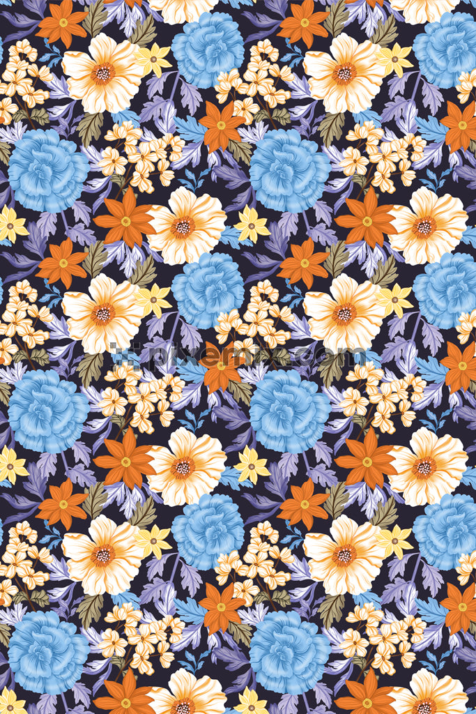 Vibrant floral pattern with multicolor blooms on a dark background.