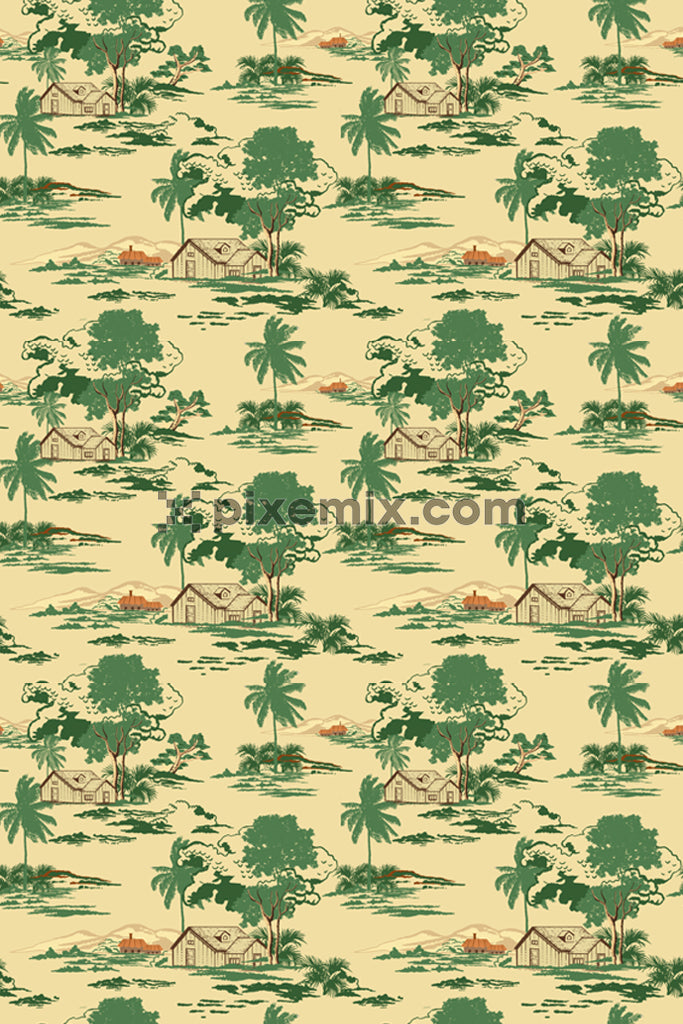 Vintage countryside landscape product graphic with seamless repeat pattern