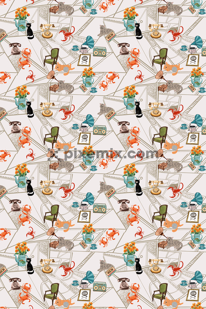 Vintage inspired collage with vintage elements, animals,and insects product graphic with seamless repeat pattern