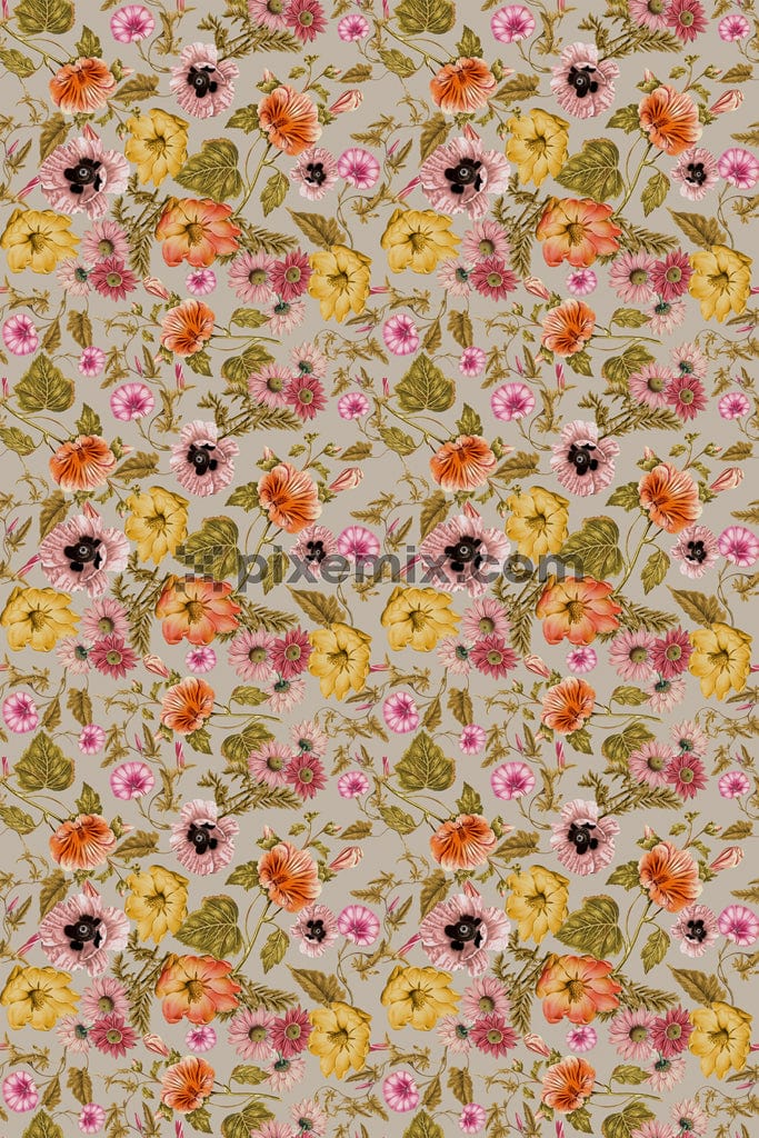 A hand drawn vintage floral illustration of tropical flowers and leaves with a seamless repeating pattern.