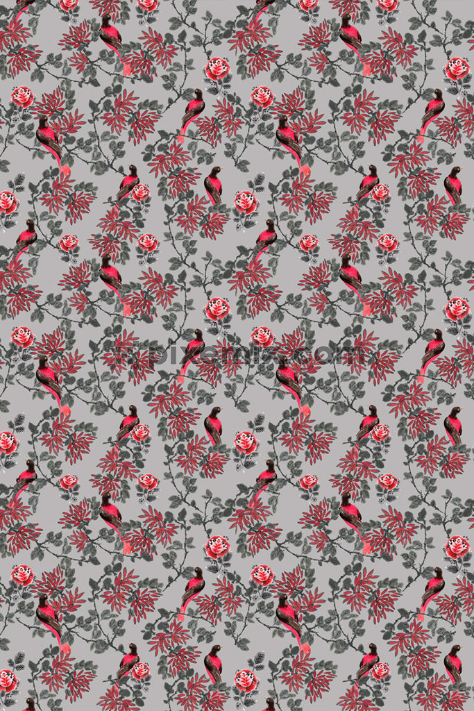 Watercolor birds and leaves product graphic with semaless repeat pattern
