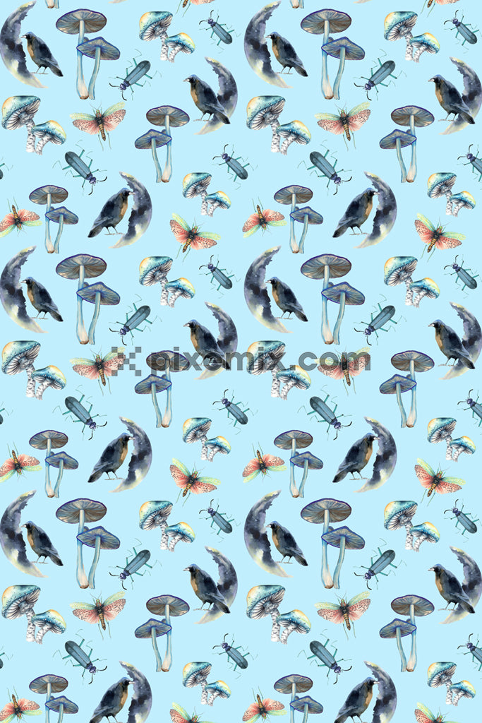 Water color mushroom & insects productgraphic with seamless repect pattern