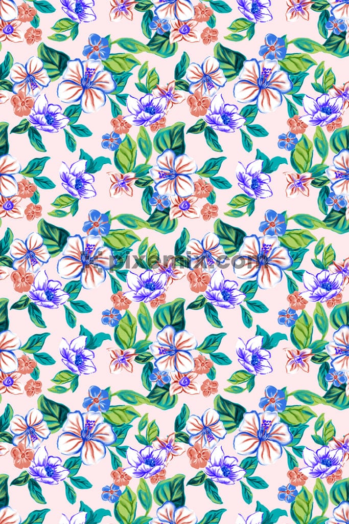 Digital art inspired watercolor florals and leaves product graphic with seamless repeat pattern