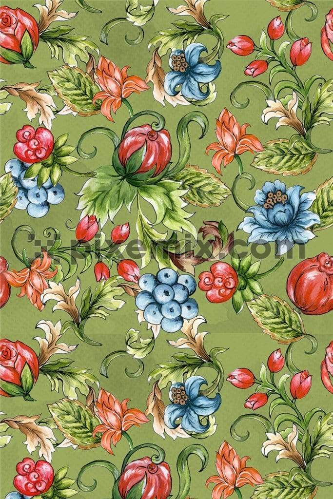 Premium hand-illustrated trend-driven water color fruits & florals product graphic seamless repeat pattern