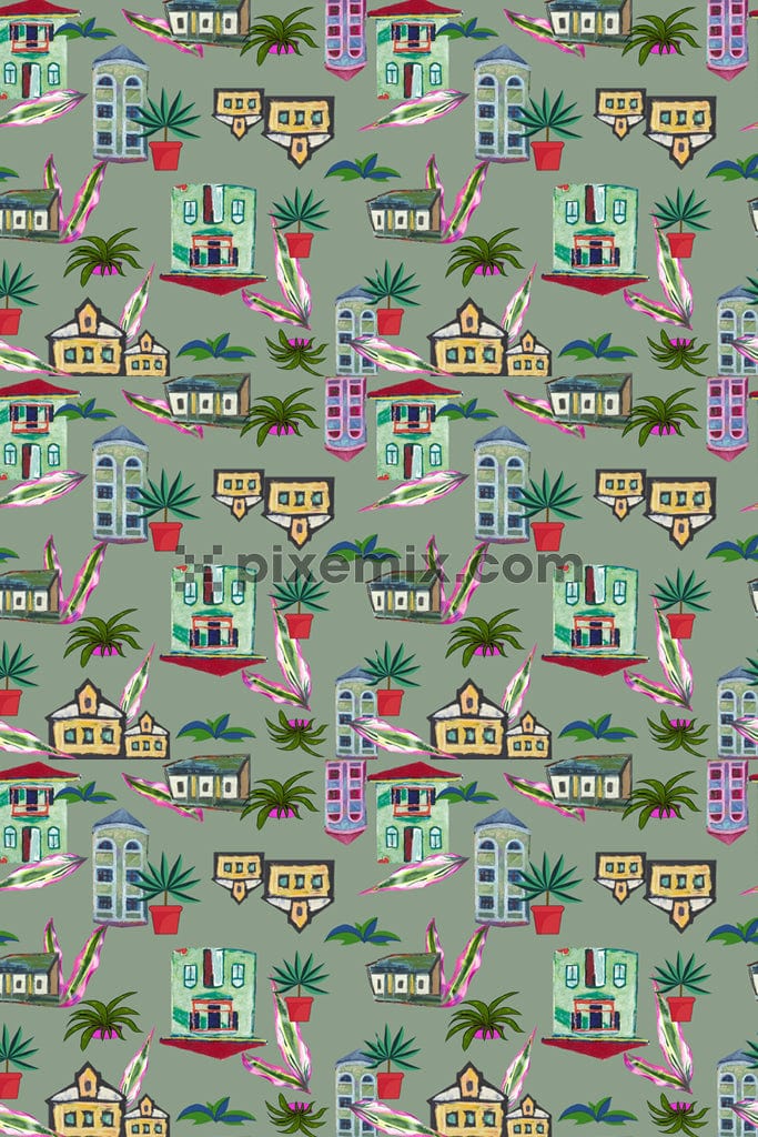 Watercolor house and leaves product graphic with seamless repeat pattern