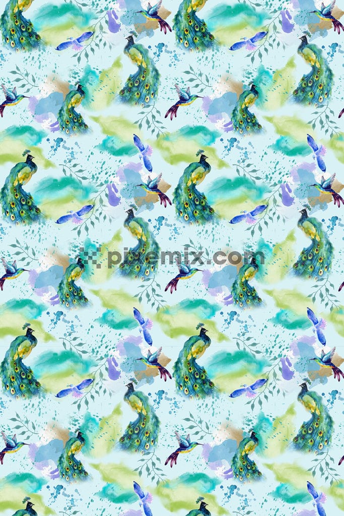 Abstract brush stroke and peacocks product graphic with seamless repeat pattern