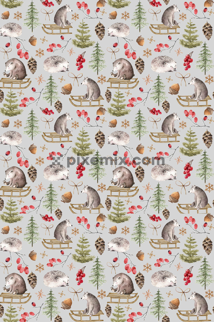 Christmas tree and animals product graphic with seamless repeat pattern