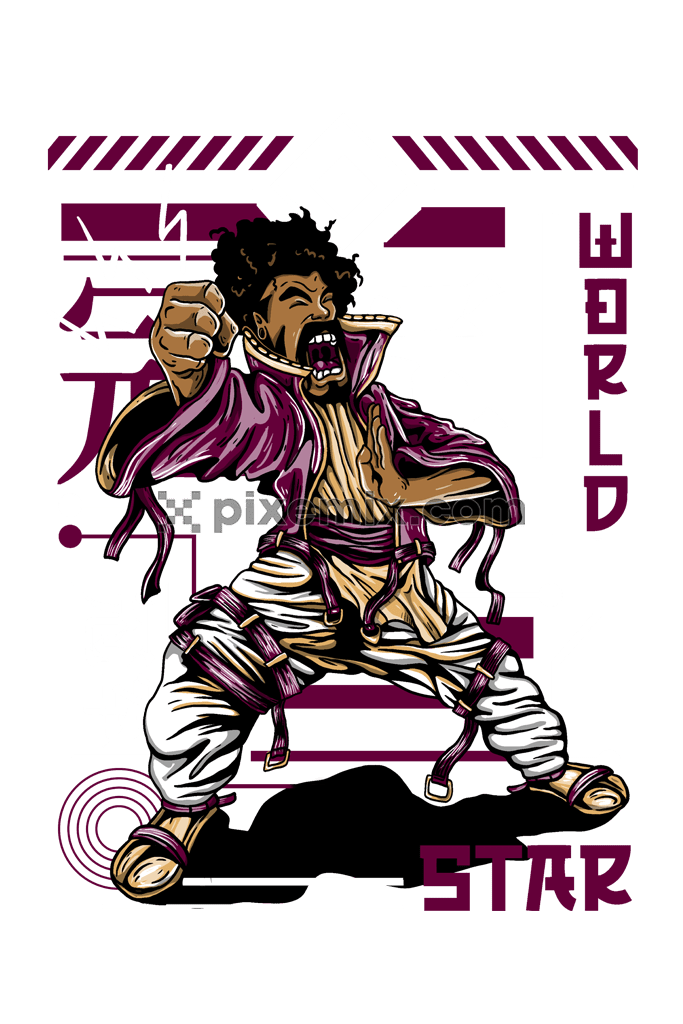 Illustration of karate man with typography product graphic.